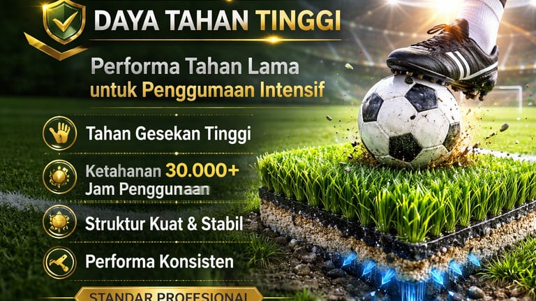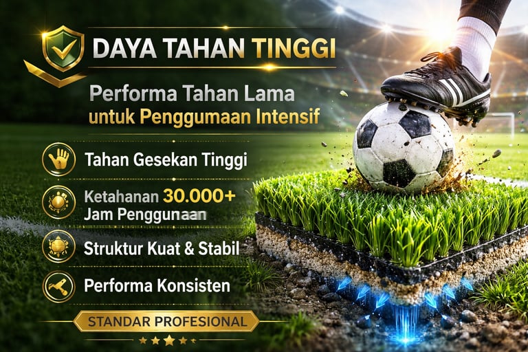 Rumput sintetis INATARA memiliki ketahanan tinggi terhadap gesekan dan penggunaan intensif, menjadikannya ideal untuk lapangan sepak bola dengan frekuensi penggunaan tinggi.